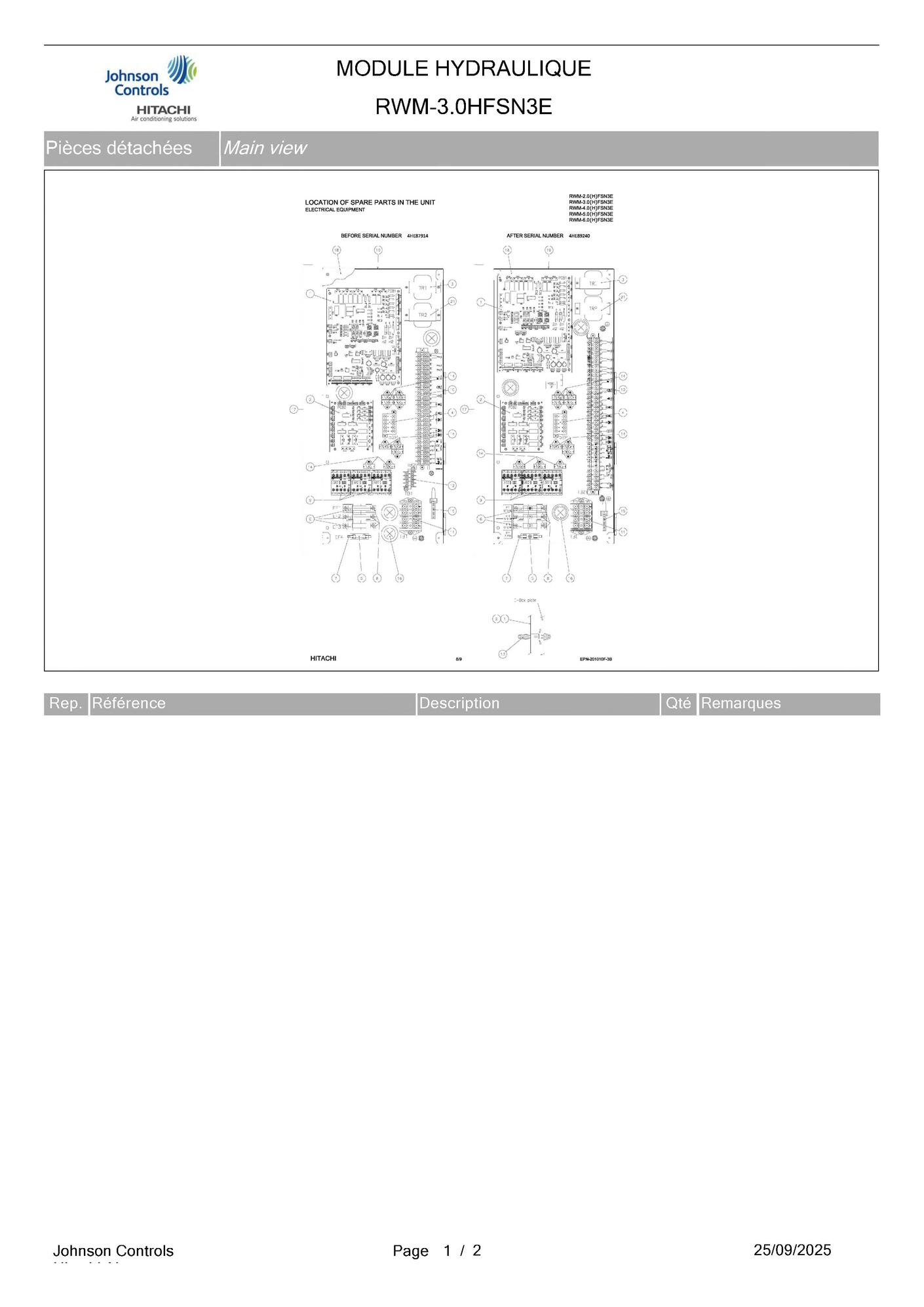 HITACHI propose des nomenclatures pouvant regrouper plusieurs modèles différents, en fonction de la puissance et de la date de fabrication. Pour identifier précisément le modèle et la référence, nous vous conseillons de télécharger et d’ouvrir le fichier PDF, ou de nous contacter muni de la référence indiquée sur la plaque signalétique de votre appareil. Sur le site PiecesXPress, en haut à droite, vous trouverez la rubrique "Demande de prix".