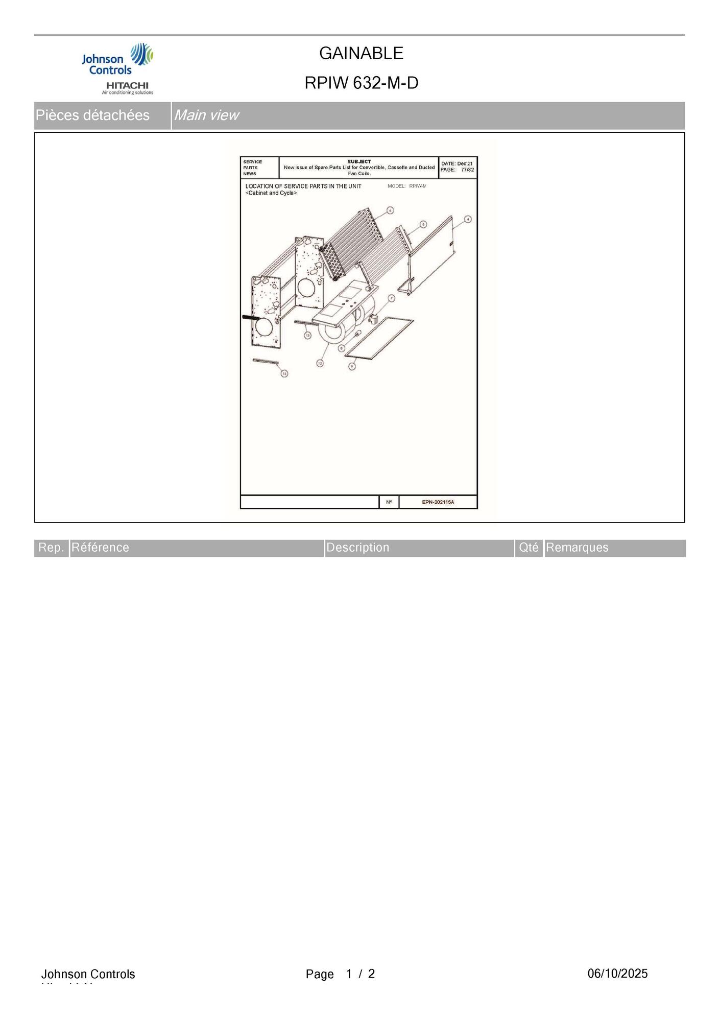 Pièces détachées contenues dans cet appareil Unité gainable Hitachi RPIW 632-M-D