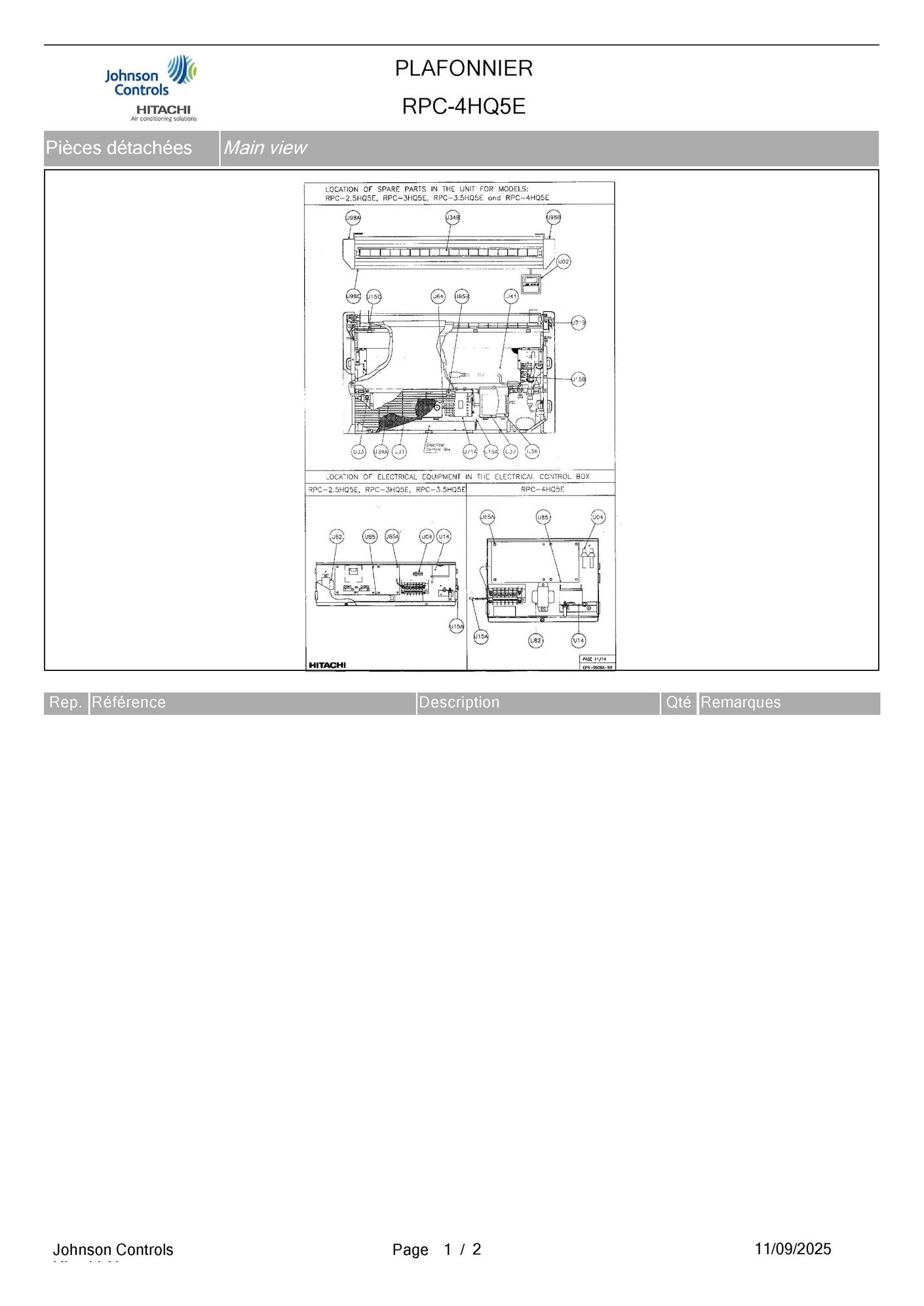 Pièces détachées contenues dans cet appareil Unité plafonnier Hitachi RPC-4HQ5E