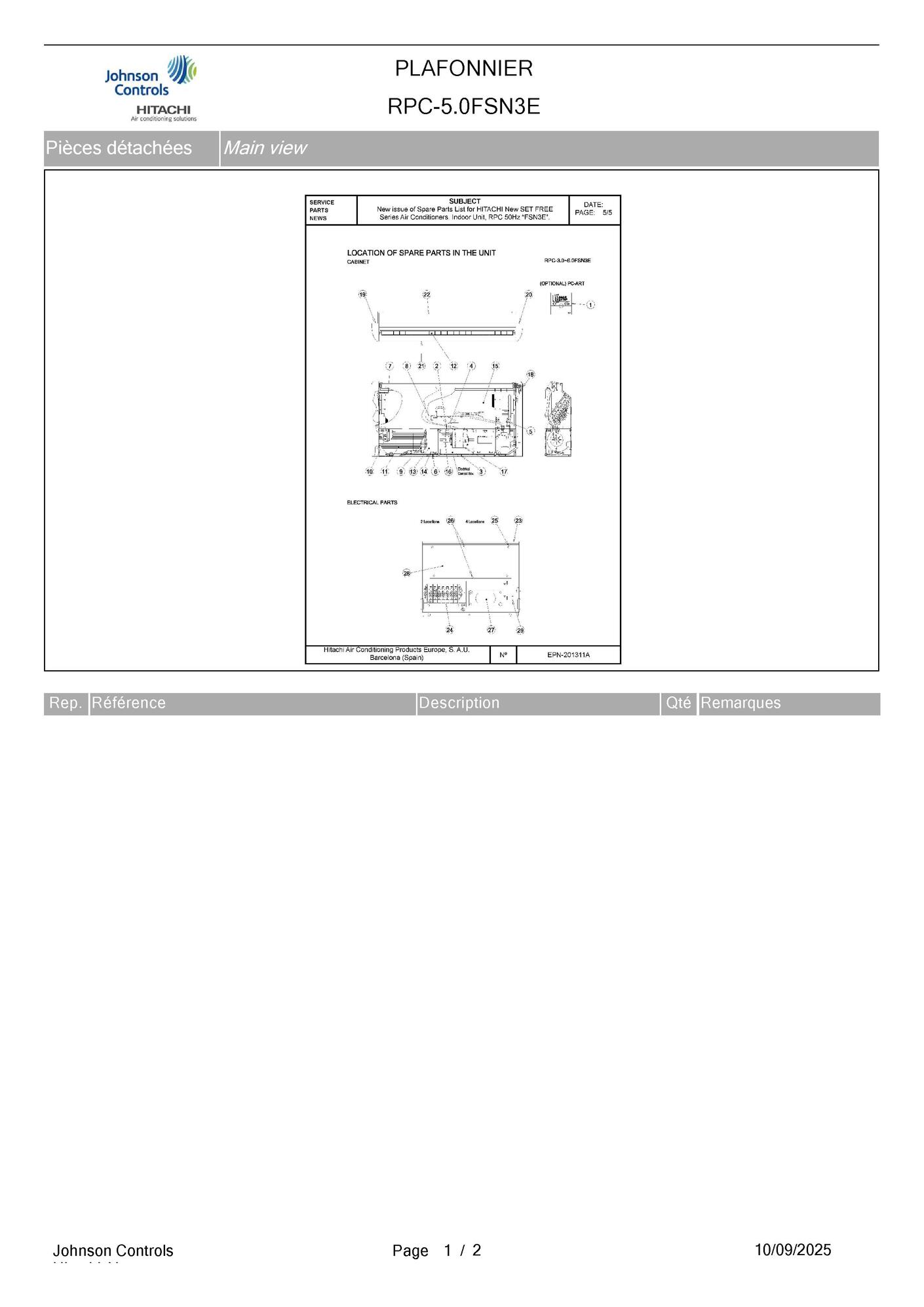 Pièces détachées Unité plafonnier Hitachi RPC-5.0FSN3E chez Pièces Express