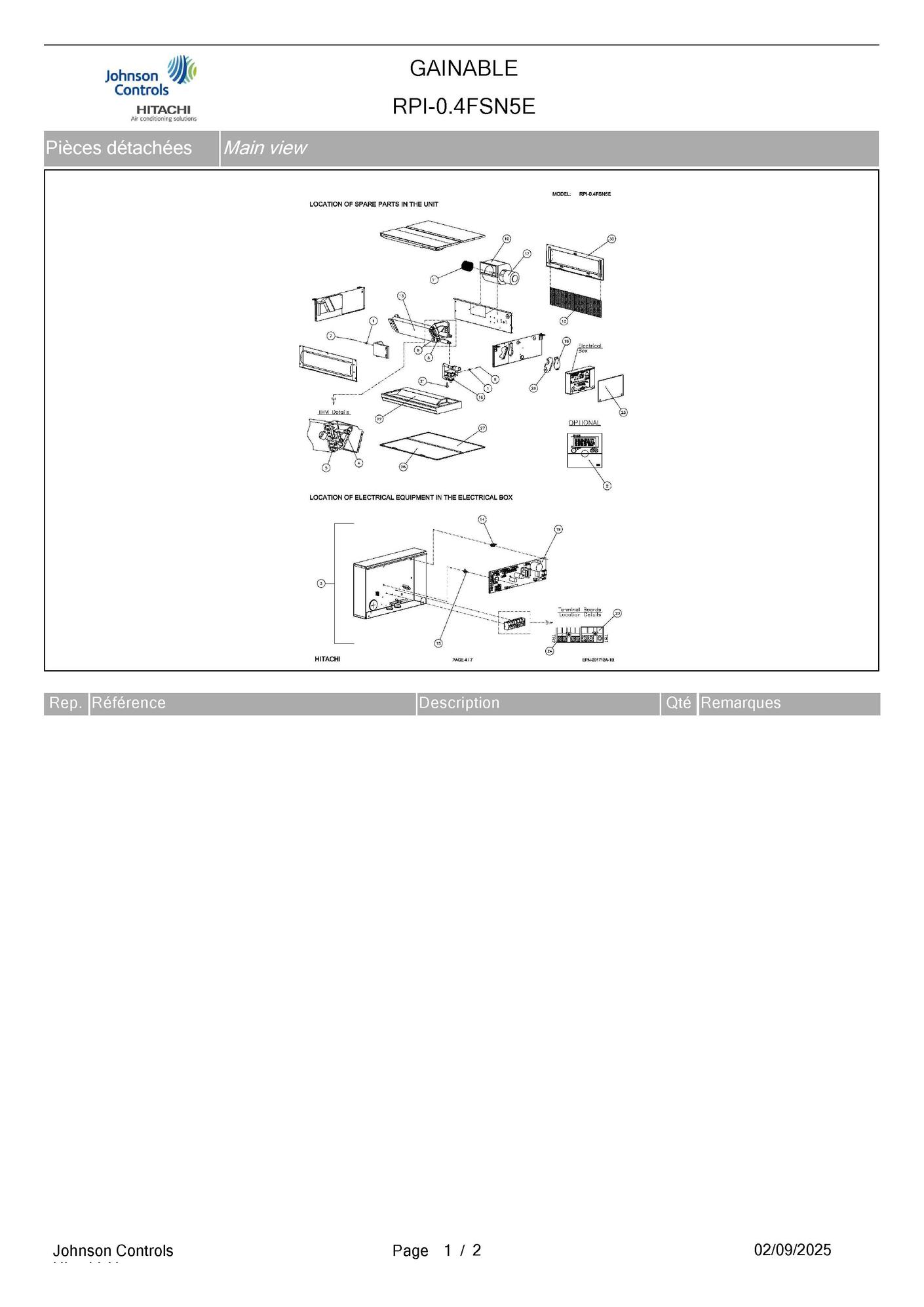 Pièces détachées Unité gainable Hitachi RPI-0.4FSN5E chez Pièces Express