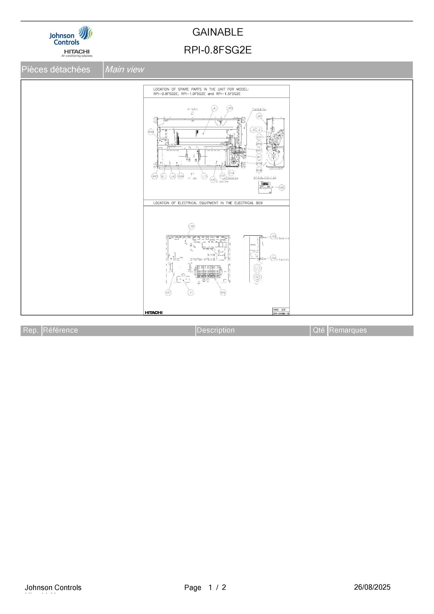 Pièces détachées contenues dans cet appareil Unité gainable Hitachi RPI-0.8FSG2E