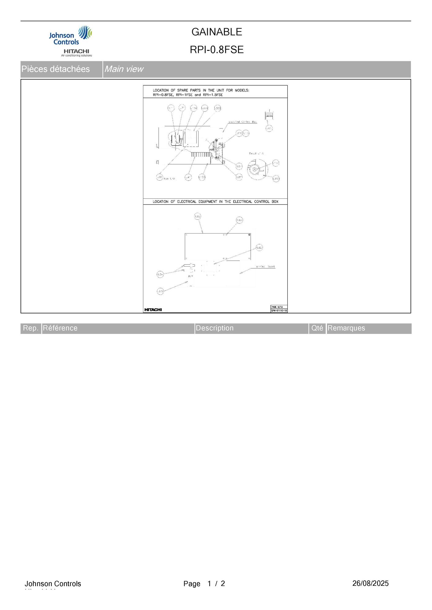 Pièces détachées contenues dans cet appareil Unité gainable Hitachi RPI-0.8FSE