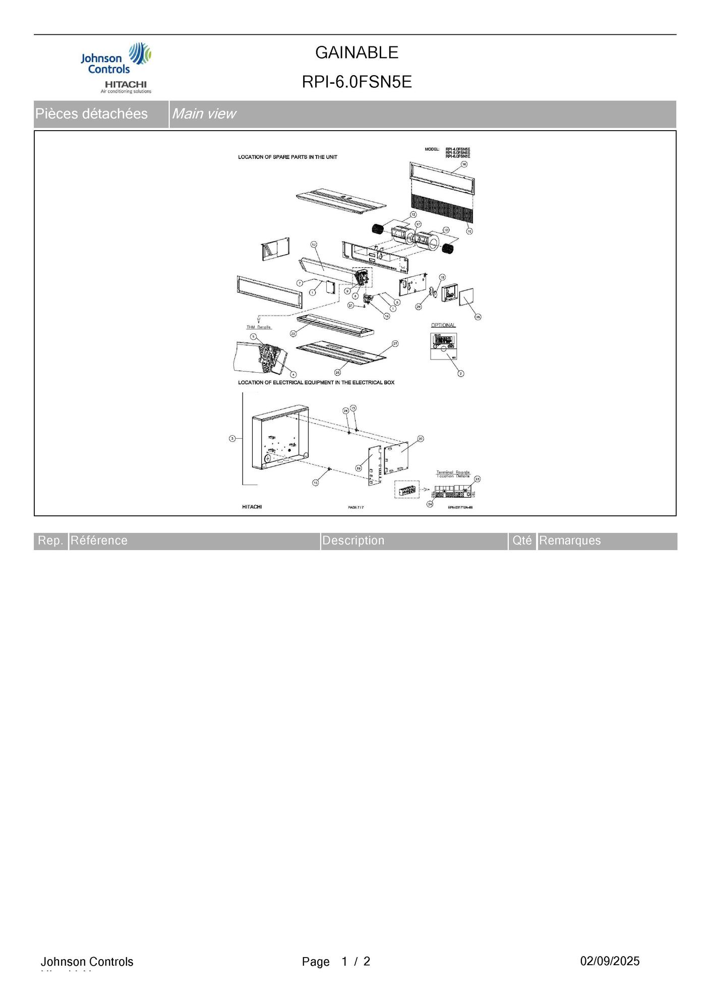 Pièces détachées contenues dans cet appareil Unité gainable Hitachi RPI-6.0FSN5E