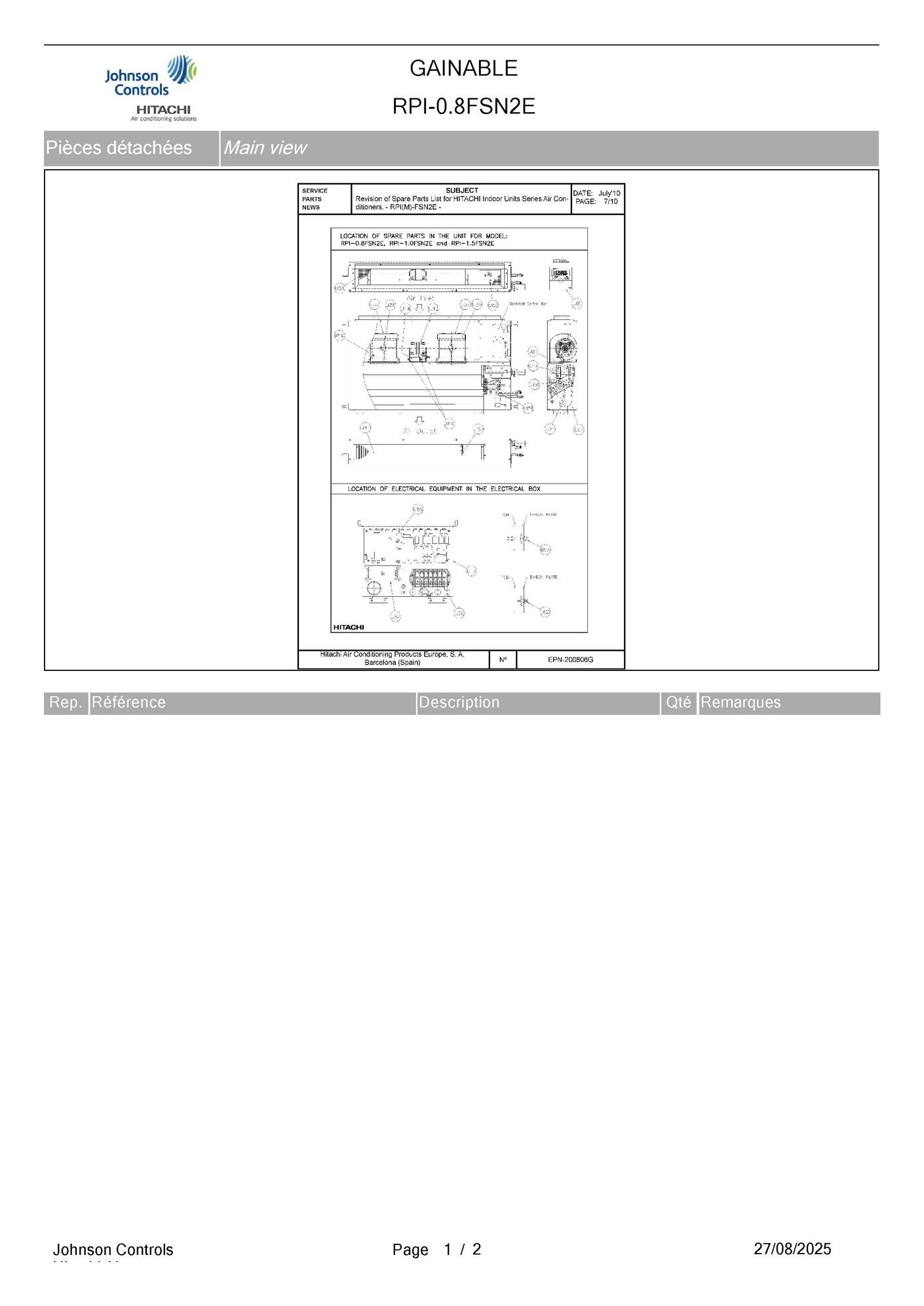 Pièces détachées contenues dans cet appareil Unité gainable Hitachi RPI-0.8FSN2E