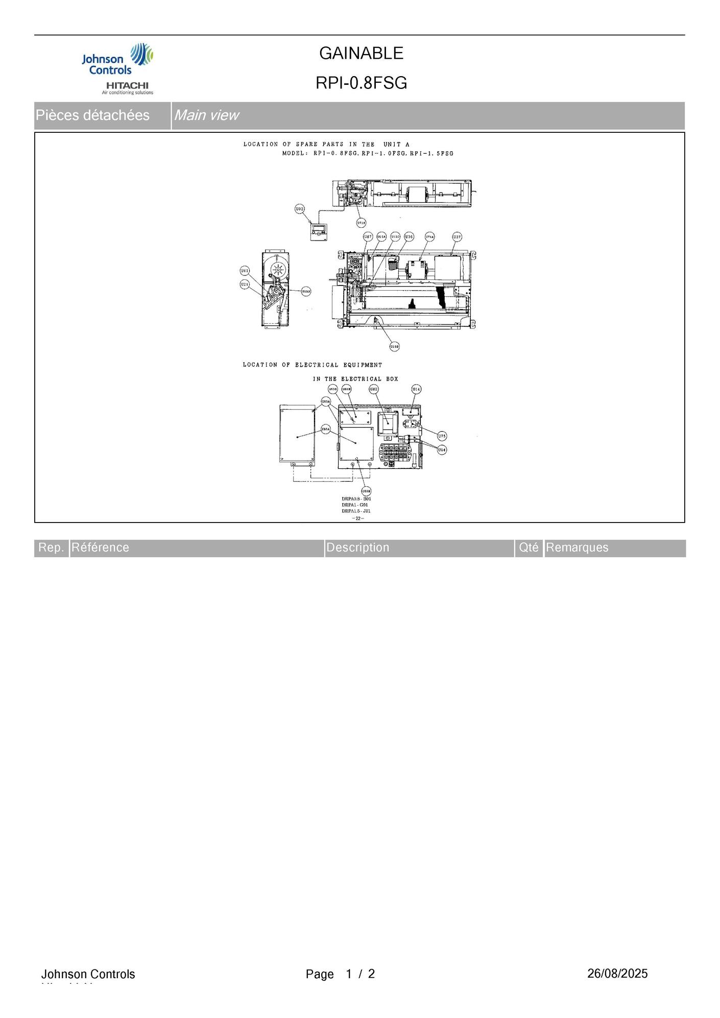 Pièces détachées contenues dans cet appareil Unité gainable Hitachi RPI-0.8FSG