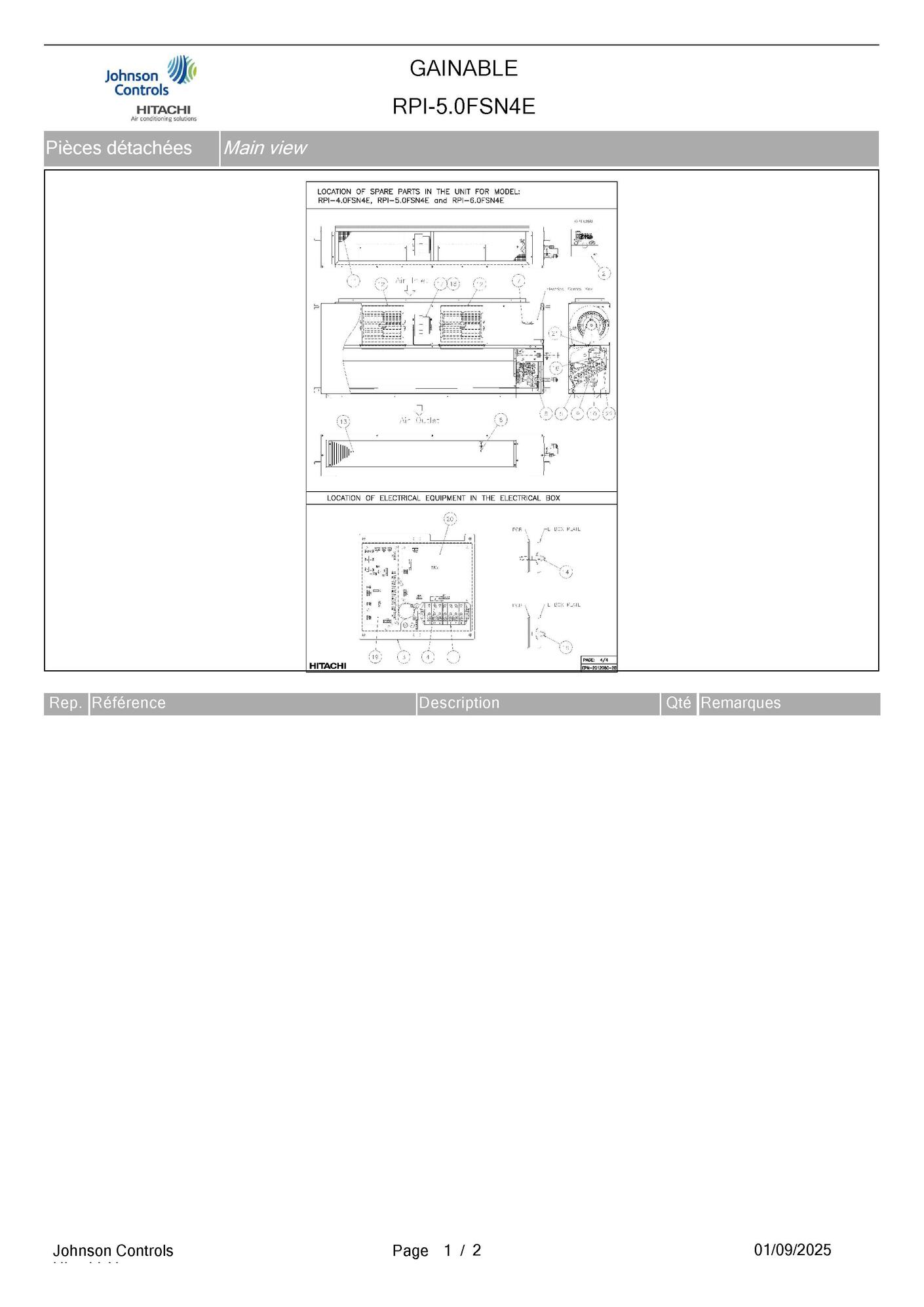Pièces détachées contenues dans cet appareil Unité gainable Hitachi RPI-5.0FSN4E