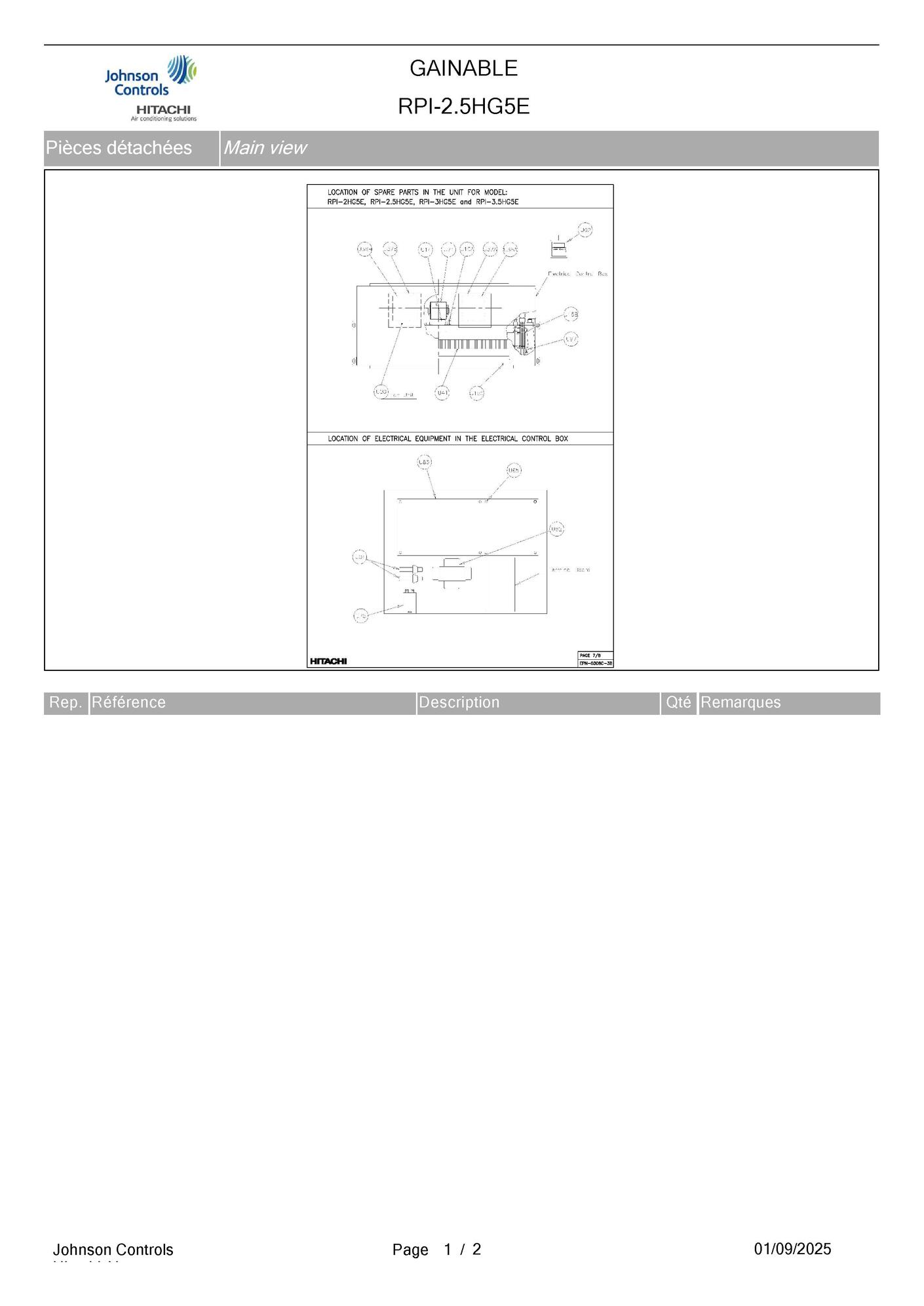 Pièces détachées contenues dans cet appareil Unité gainable Hitachi RPI-2.5HG5E