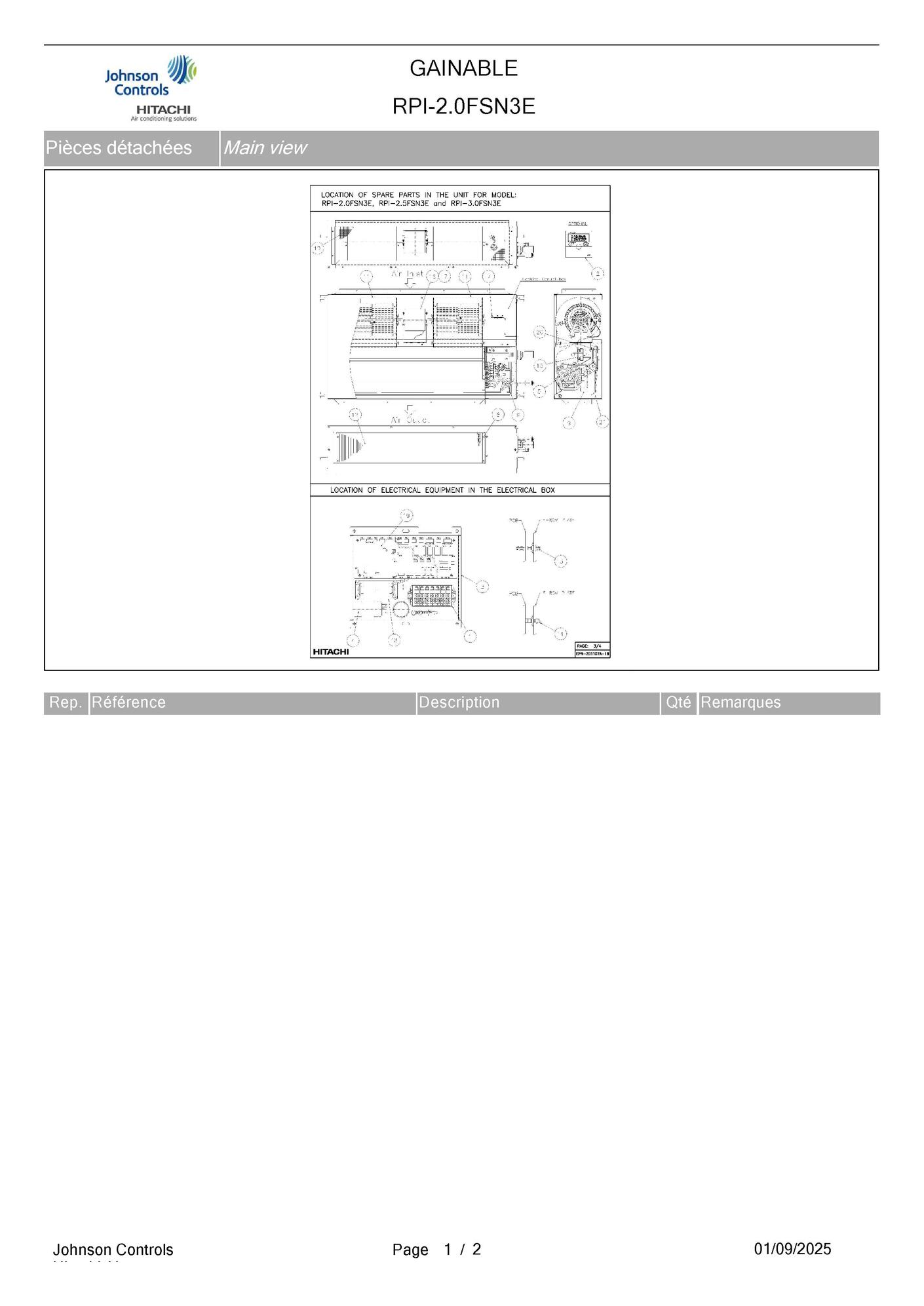Pièces détachées contenues dans cet appareil Unité gainable Hitachi RPI-2.0FSN3E