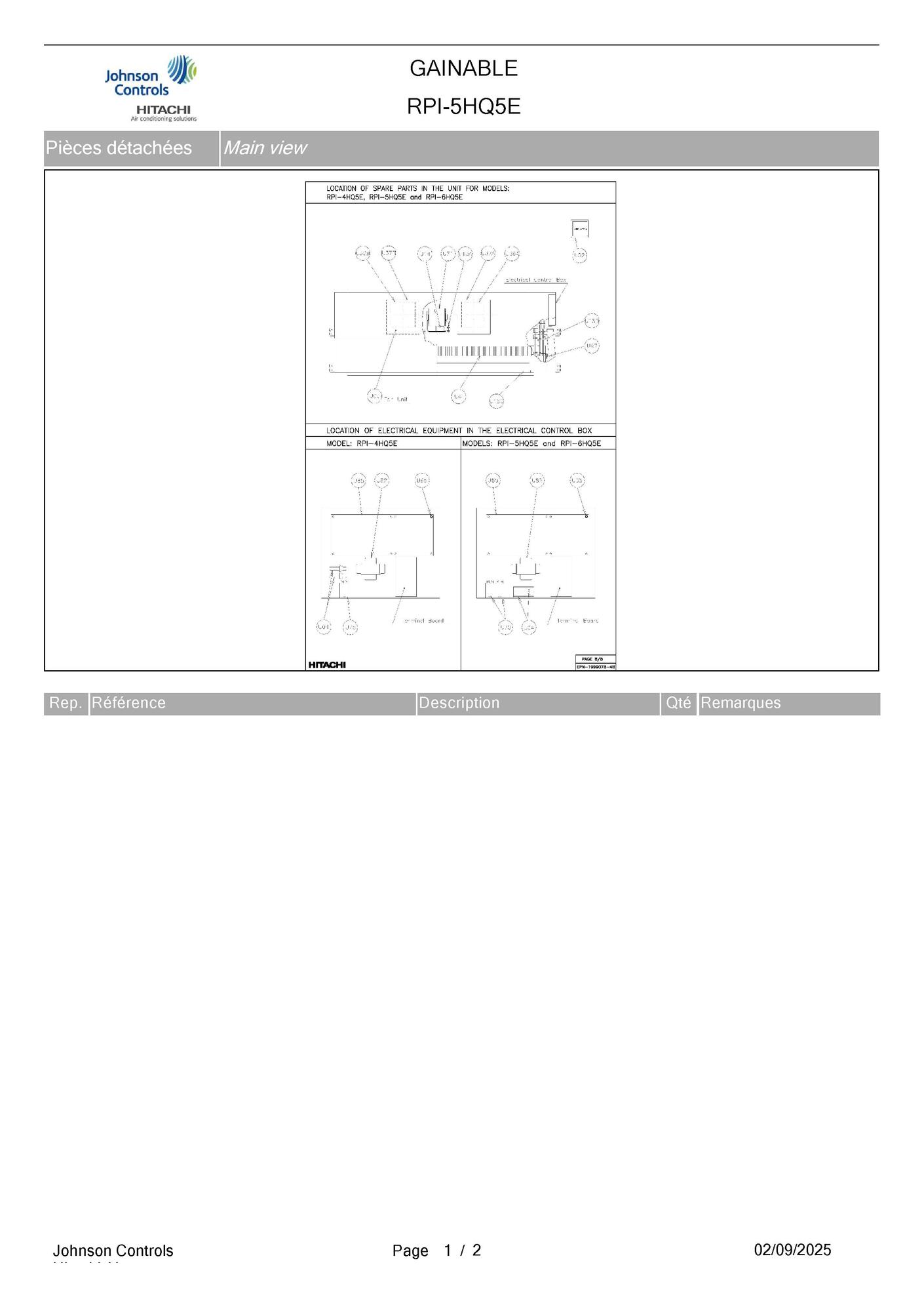 Pièces détachées Unité gainable Hitachi RPI-5HQ5E chez Pièces Express