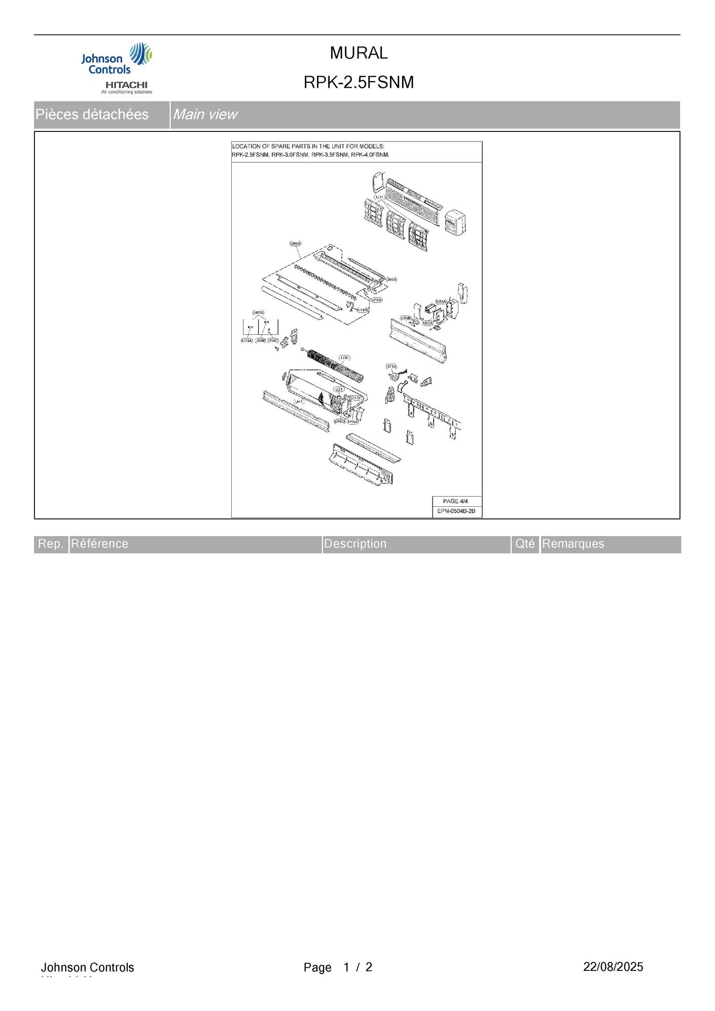 Pièces détachées Unité murale Hitachi RPK-2.5FSNM chez Pièces Express