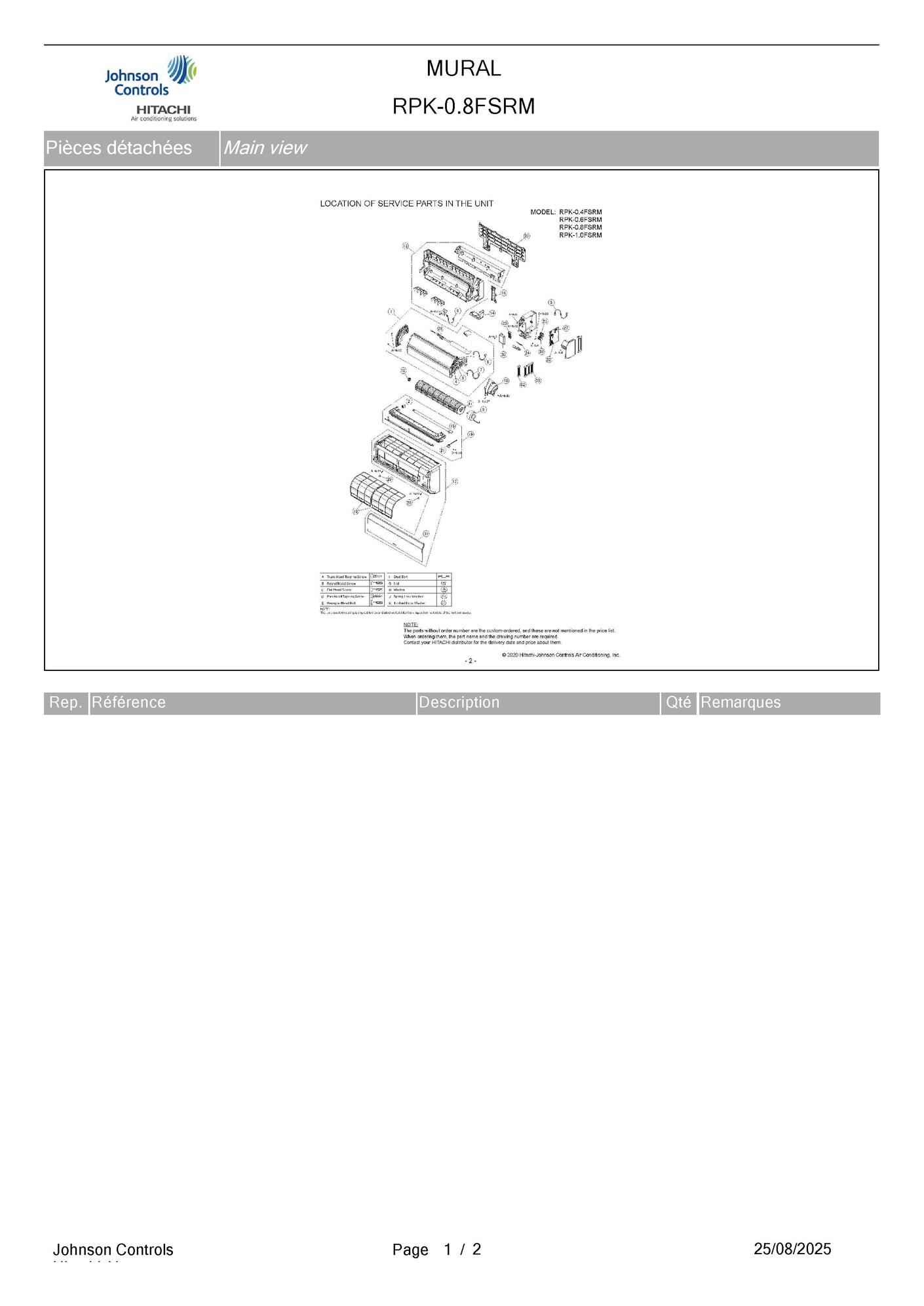 Pièces détachées Unité murale Hitachi RPK-0.8FSRM chez Pièces Express