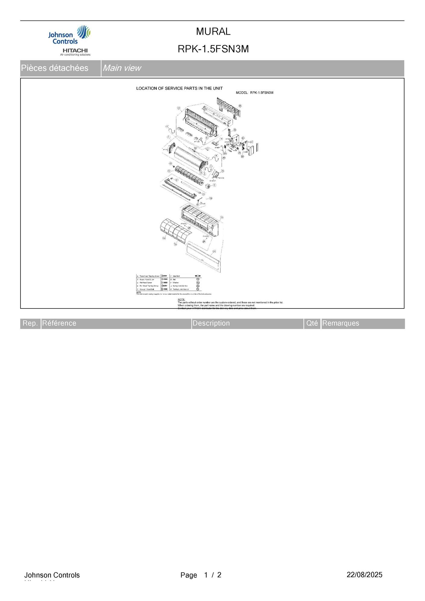Pièces détachées Unité murale Hitachi RPK-1.5FSN3M chez Pièces Express