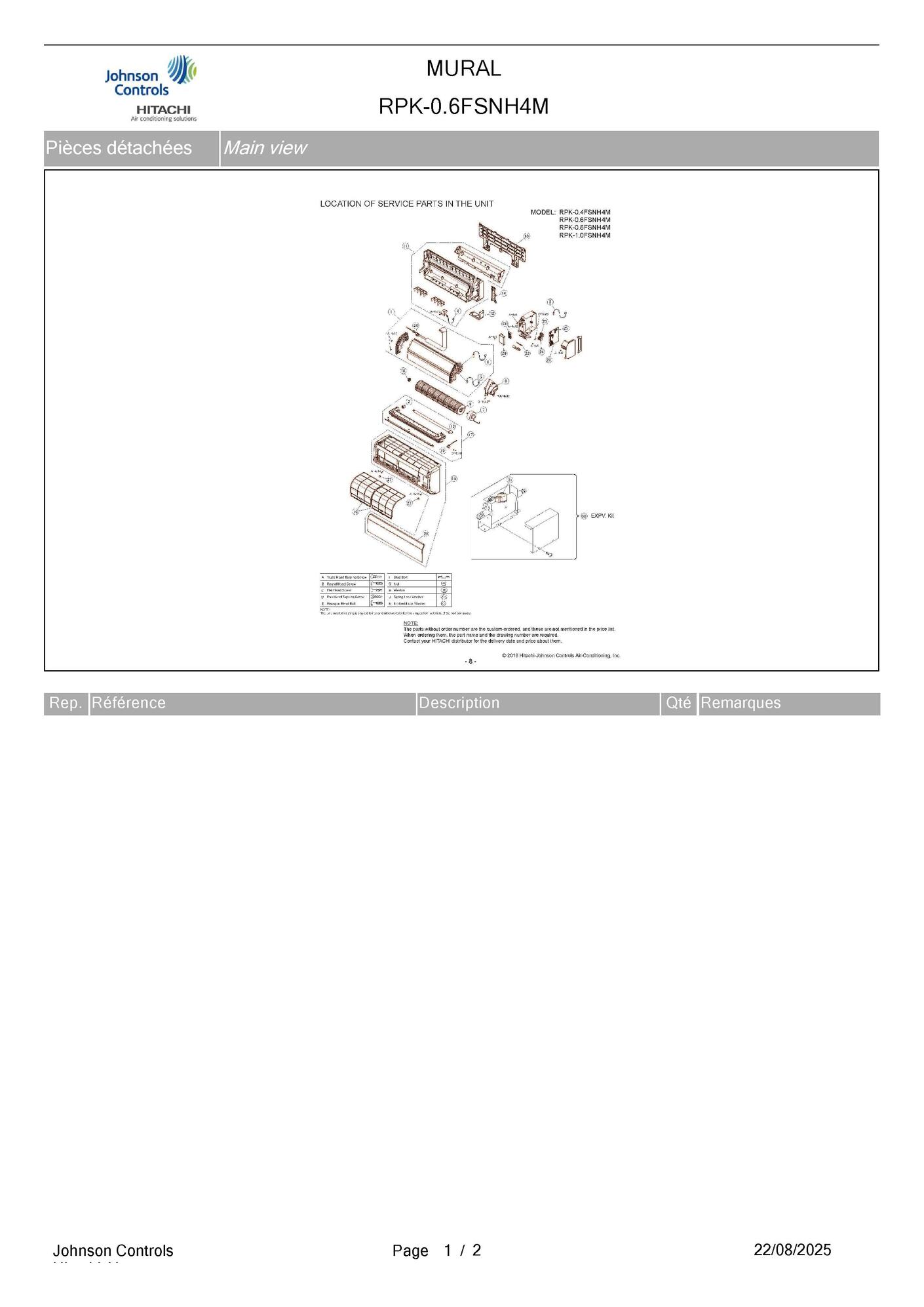 Pièces détachées contenues dans cet appareil Unité murale Hitachi RPK-0.6FSNH4M