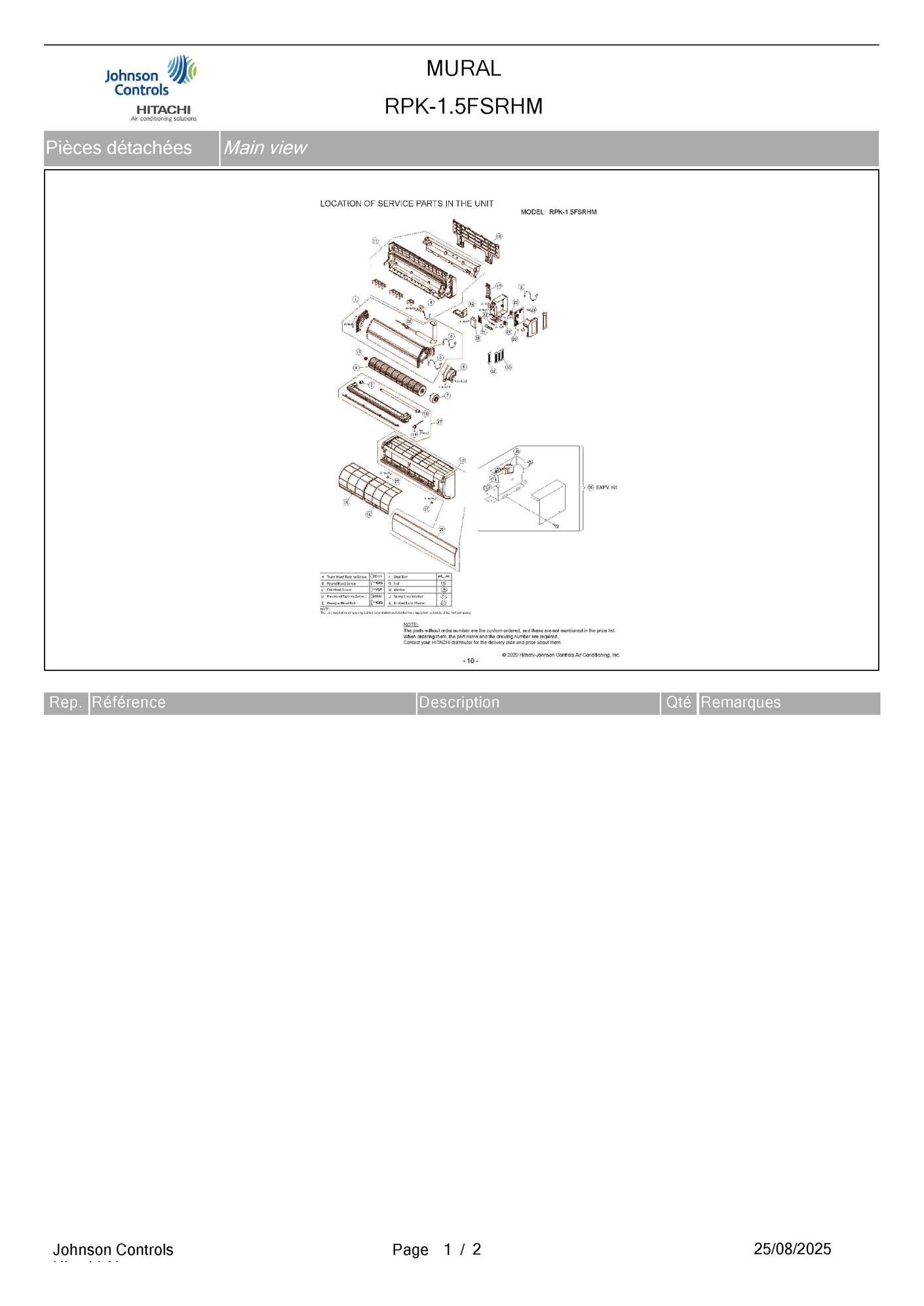 Pièces détachées Unité murale Hitachi RPK-1.5FSRHM chez Pièces Express