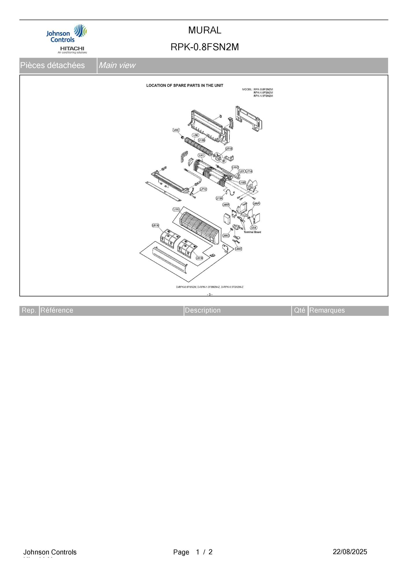 Pièces détachées contenues dans cet appareil Unité murale Hitachi RPK-0.8FSN2M